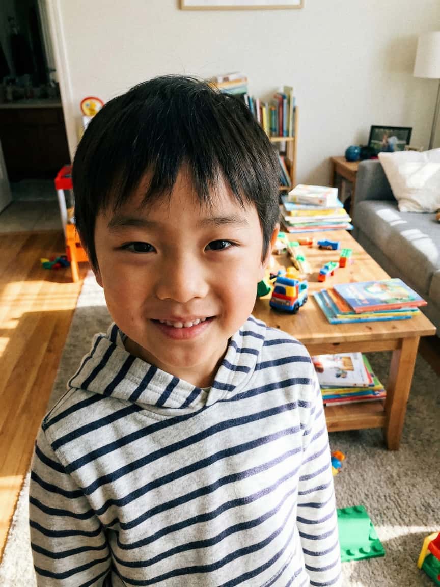Busy comic textures can compete with the subject. A layout that frames the face with breathing room keeps the birthday kid as the clear focal point.